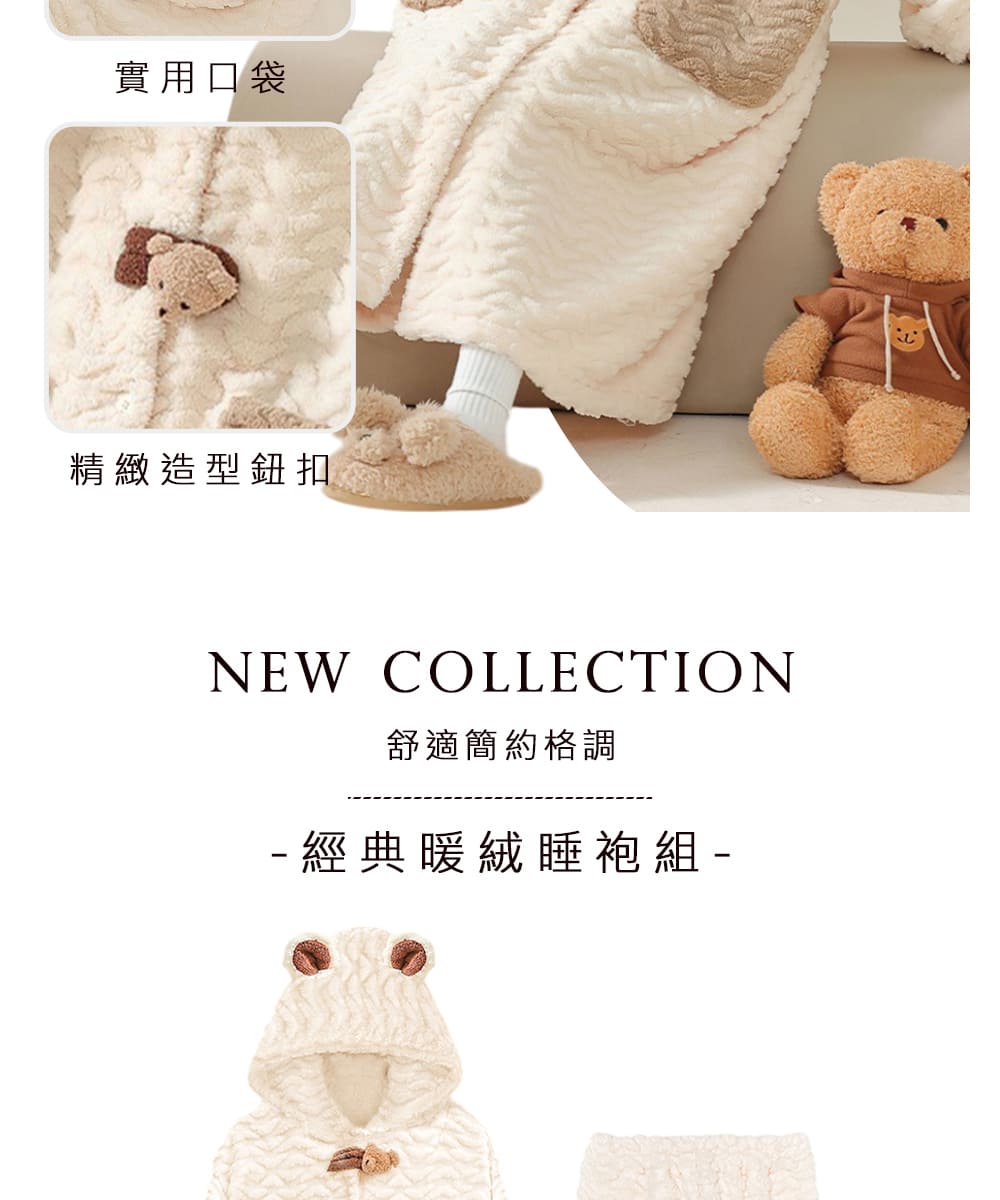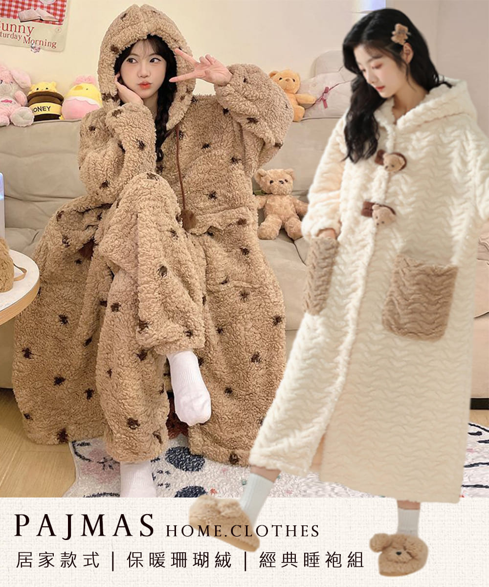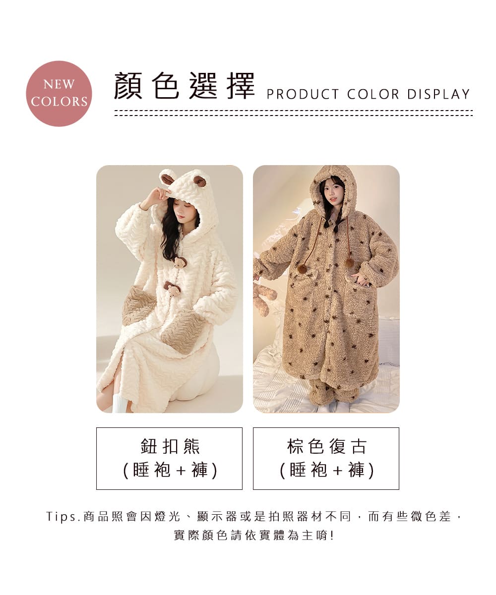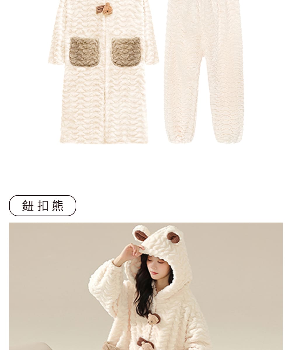 【Kosmiya】1套 極厚暖法蘭絨 可愛熊長袖睡袍睡褲/女睡衣/居家服/睡衣套裝/保暖睡衣(2色可選/均碼/加大碼)